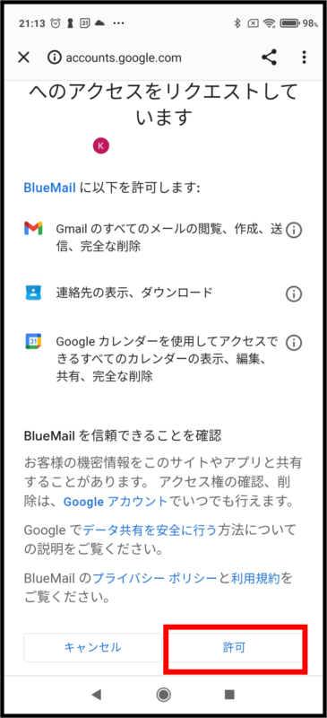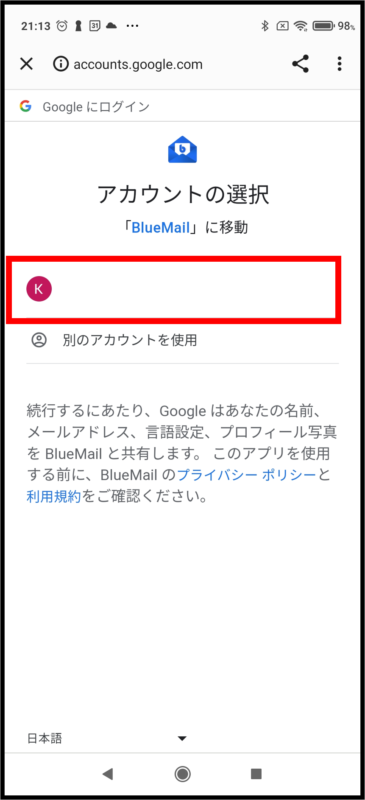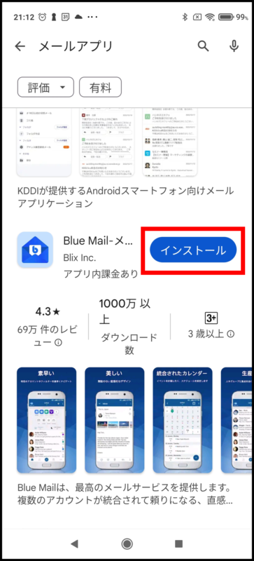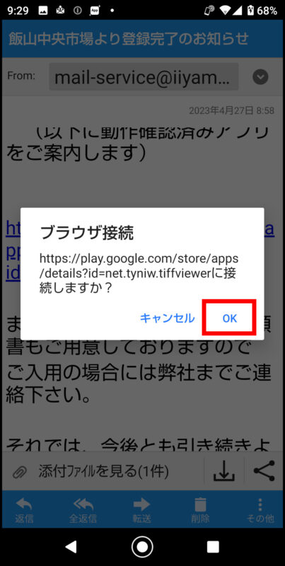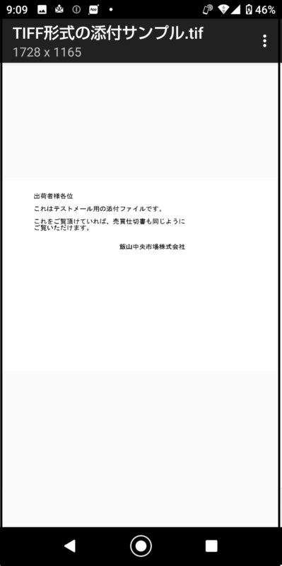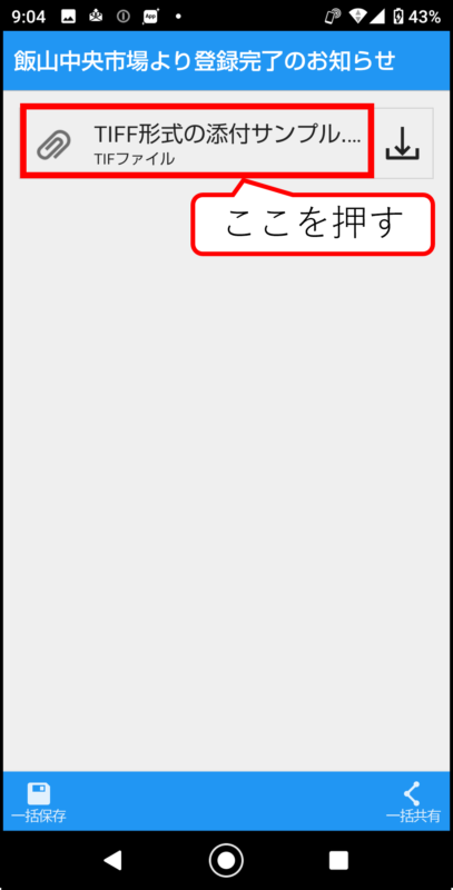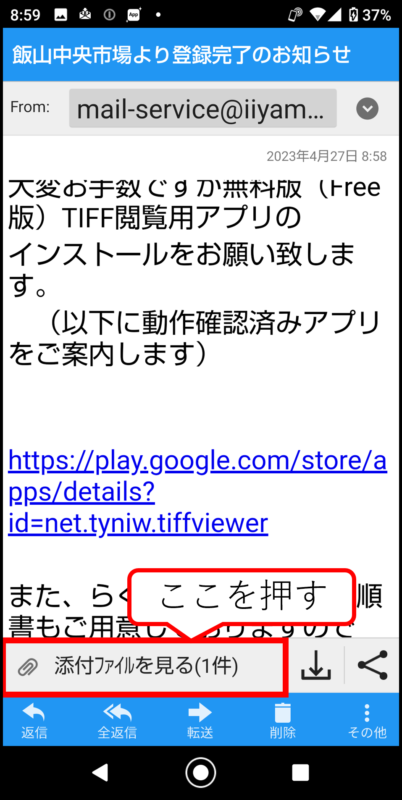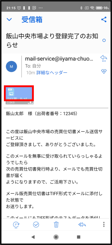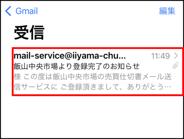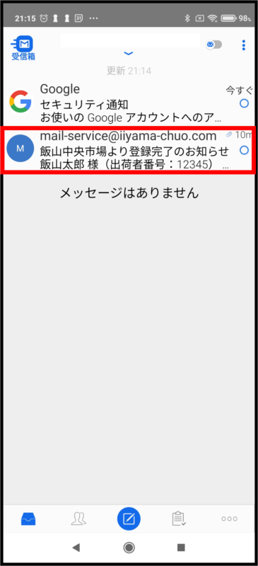 ①Blue Mail(アプリ)で飯山中央市場からのメールを開く